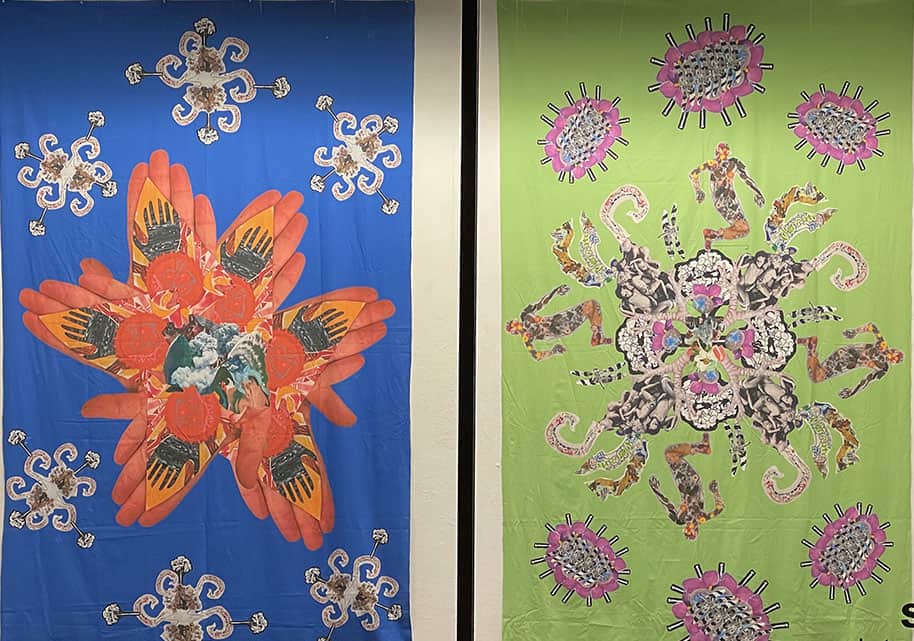 “Banners for Boiling World” is a collaborative project featured at SLOT Window Gallery on Botany Rd, Sydney. A work that was made by many hands, “Banners for Boiling World” discusses ways of caring for the earth, future possibilities, and collective responsibility in regard to climate change. When faced with an impending climate catastrophe, engaging in social interactions where new attitudes and understandings are fostered is crucial. This work builds upon principles of collage to discuss the social and psychological dimensions of the climate crisis.